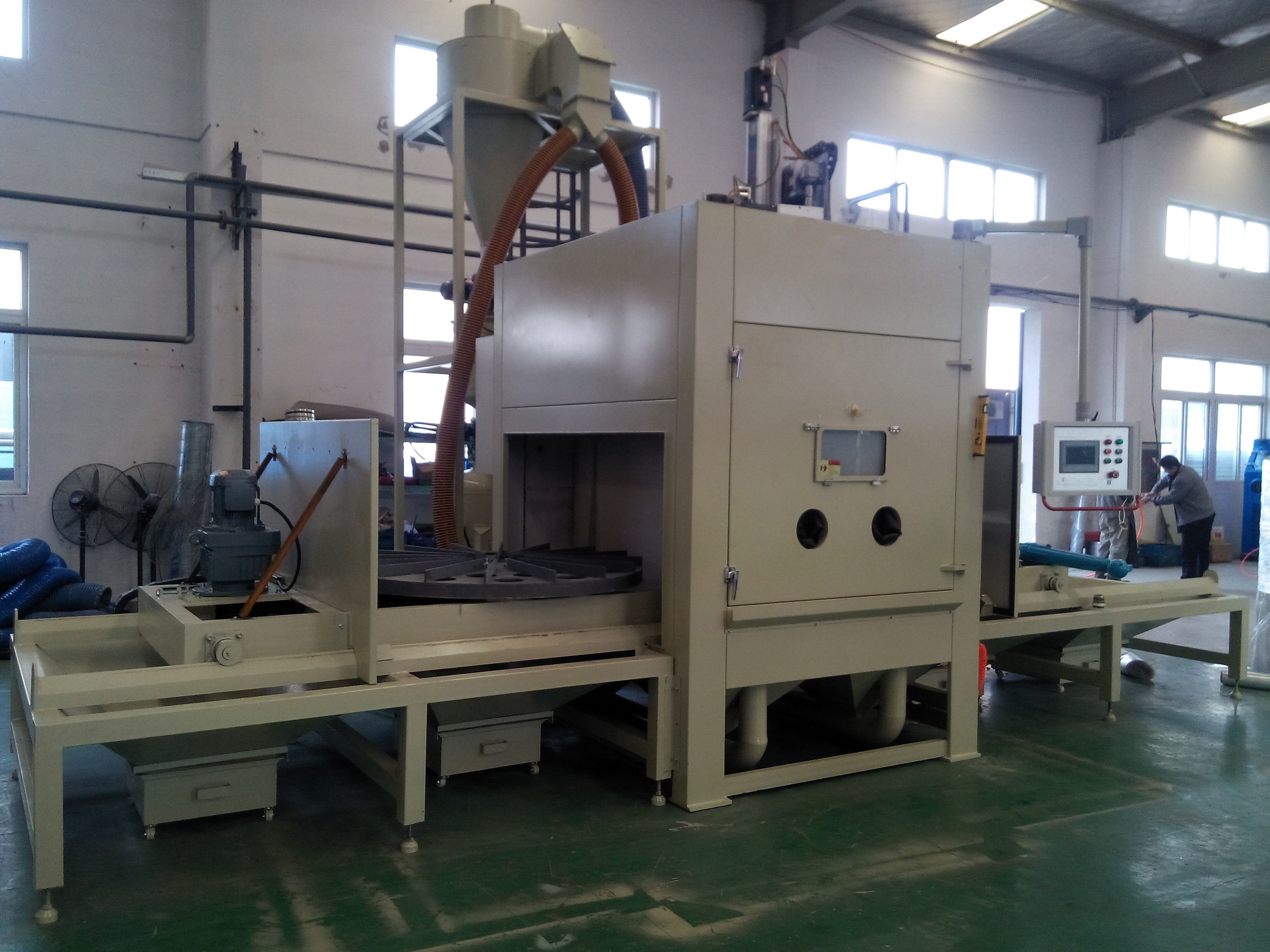 6、 吹凈完畢,臺車轉盤退出并取下工件,另端轉盤工件進入,如此循環,完成間歇式噴砂加工。